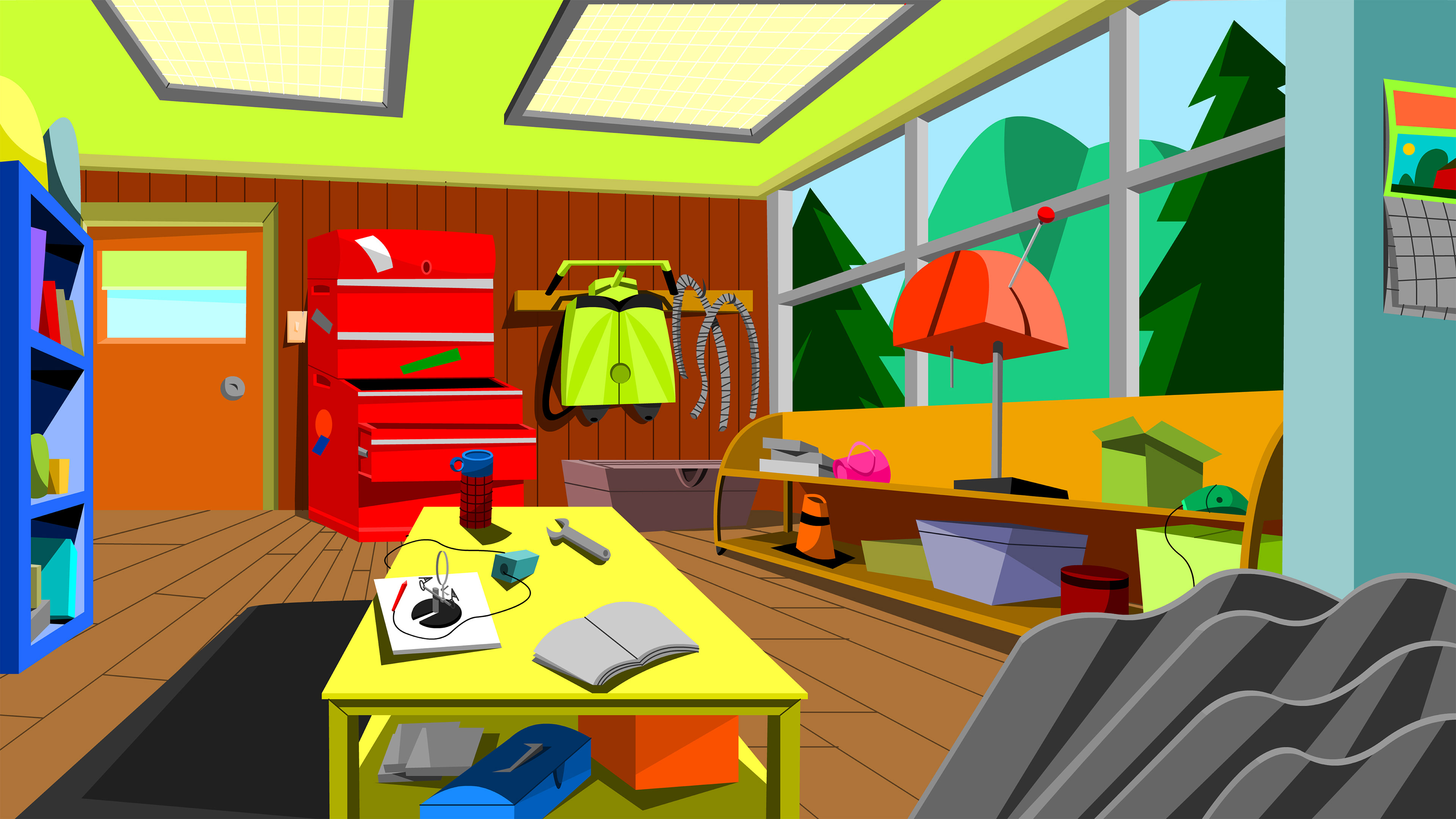 Work room/garage, jet packs and tools what more can you ask for. 2D Concept art to be rendered 3D in a fully interactive game.